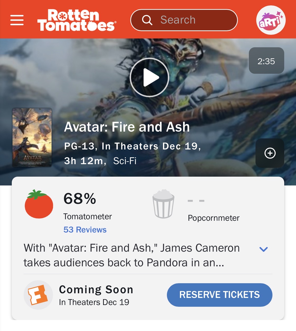 오늘 개봉하는 아바타3 로튼토마토 공개