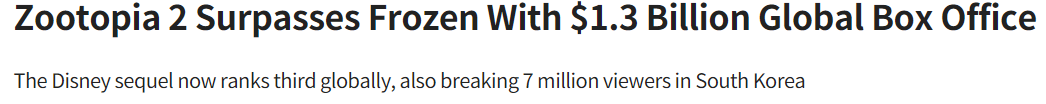 - '겨울왕국 1(12억불)'과 '슈퍼 마리오(13억불)'의 흥행을 뛰어넘음