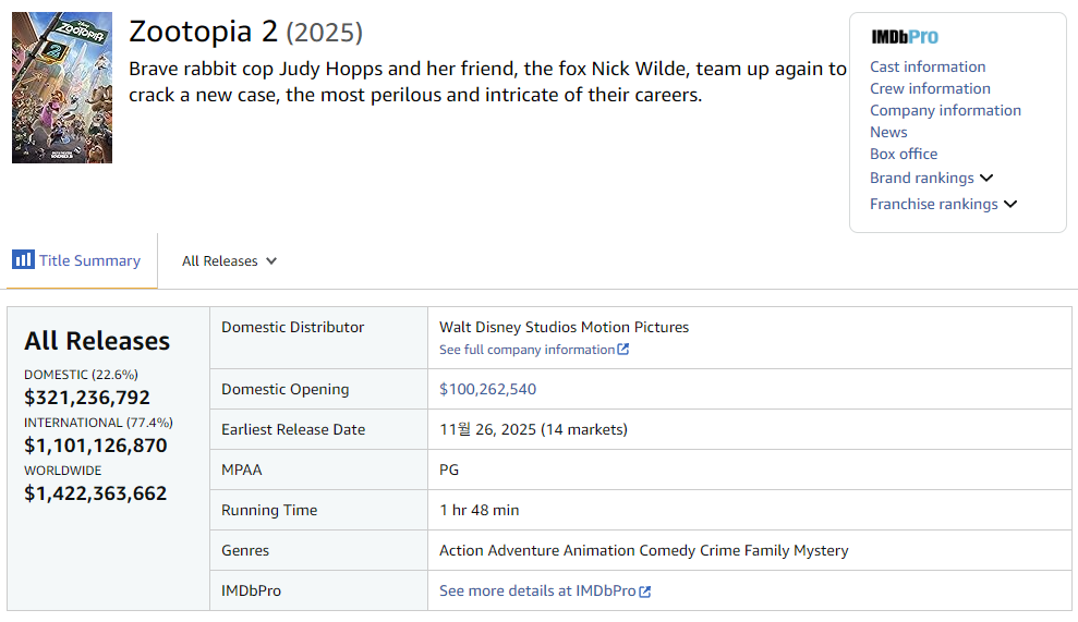 - 현재 '월드 디즈니 애니메이션 스튜디오 역사상 올타임 넘버 2'의 흥행 기록