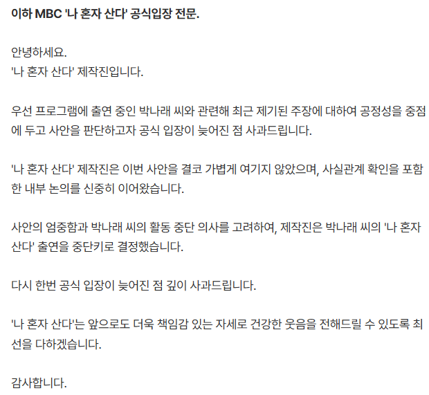 MBC 나혼자산다 공식입장문 뜸