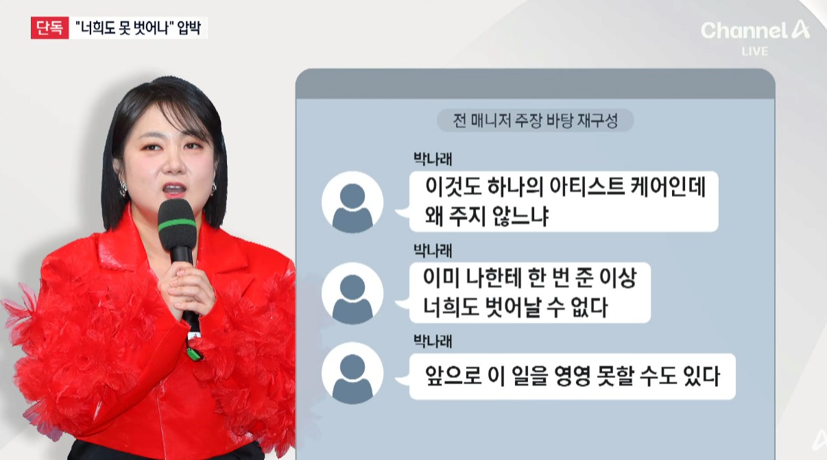 전 매니저는 지난 8일 경찰에 고소장을 접수하면서 '박 씨의 강요 정황이 담긴 메시지 캡처 사진들도 제출했다'고 주장했습니다.