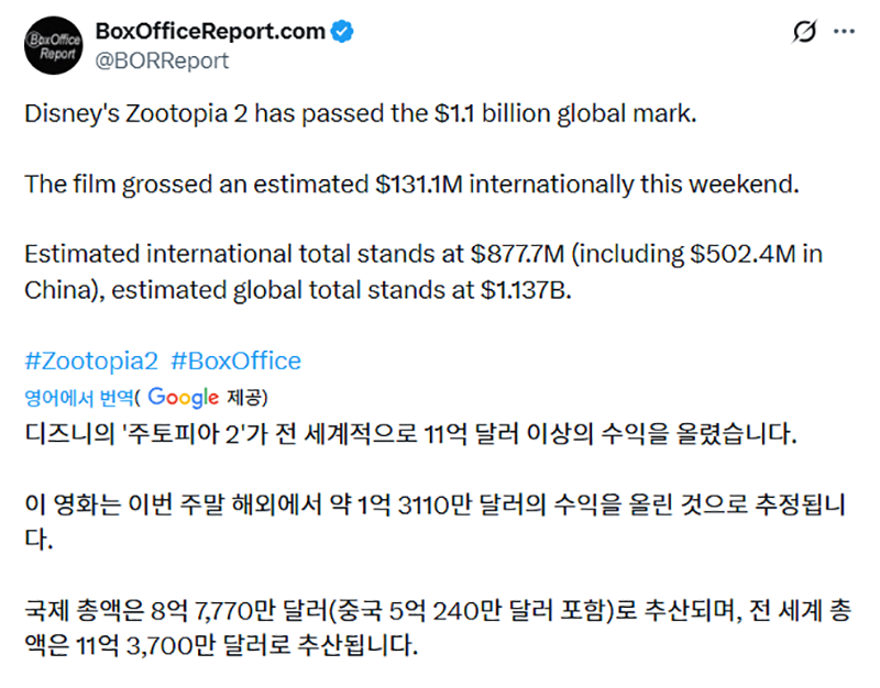 <주토피아 2> 2025년 할리우드 영화 흥행 1위 달성