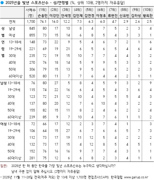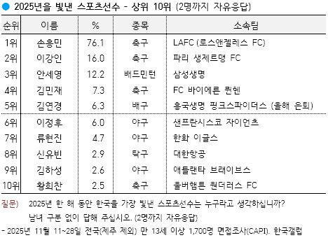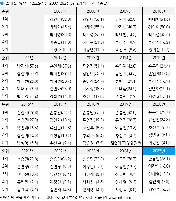 갤럽, 손흥민 선호도 9년 연속 1위