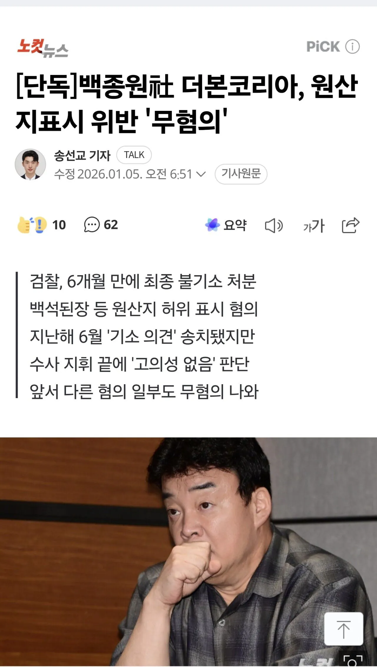 백종원 더본코리아, 원산지표시 위반 "무혐의"