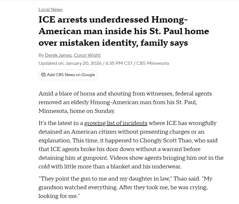 미네소타 세인트폴에서 ICE가 훙가(Hmong)-미국인 노인을 속옷 차림으로 집에서 끌어내 체포한 사건을 다룬 CBS Minnesota 기사입니다. 이 할아버지는 미국 시민권자로, 오인 체포였습니다.