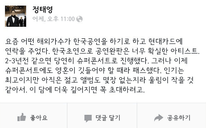 이시기에 다른 세계적인 아티스트가 슈퍼콘서트 진행을 알고 하고 싶다고 현대카드에 먼저 연락을 함.