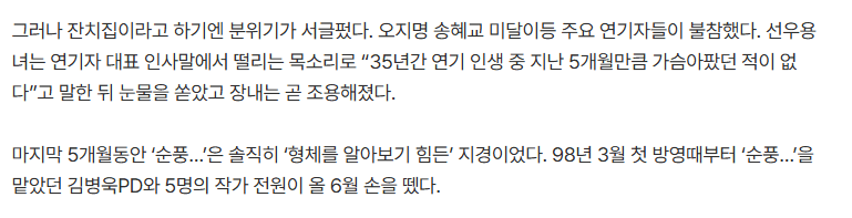 종방연에 주요 출연진들이 거의 대부분 참가하지 않았고 선우용녀 역시 연장방송 시기에 너무 가슴이 아팠다는 인터뷰를 볼때