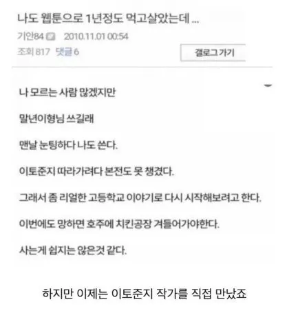웹툰으로 1년정도 먹고 살았는데 이토준지 따라하다 망함