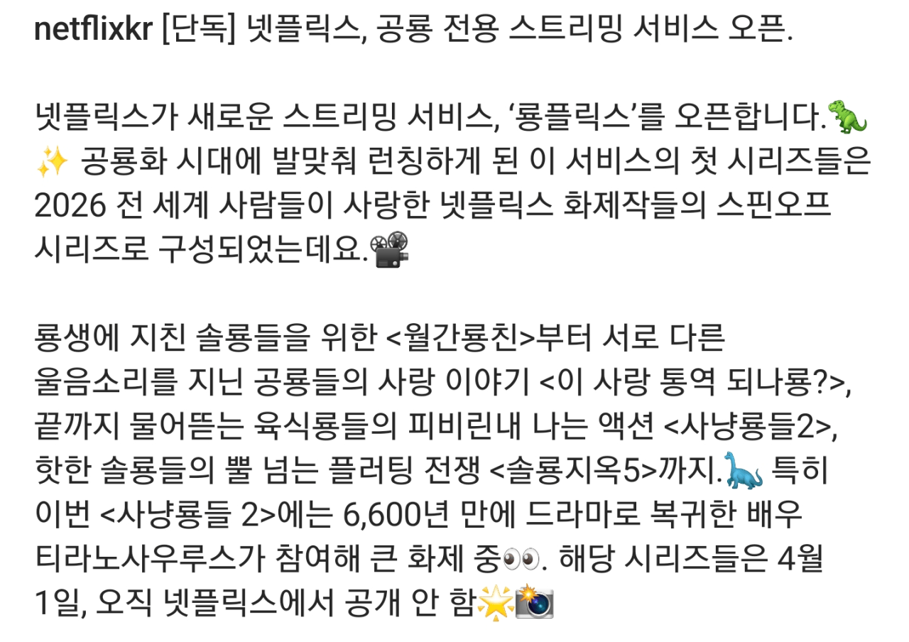 넷플릭스 공룡 전용 스트리밍 서비스 <룡플릭스> 오픈