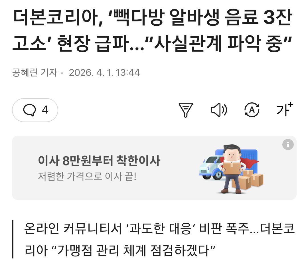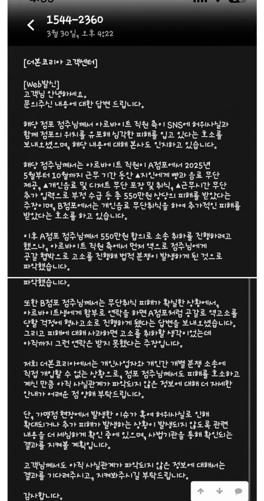그러자 더본코리아 고객센터에서 저 답변이 나옴