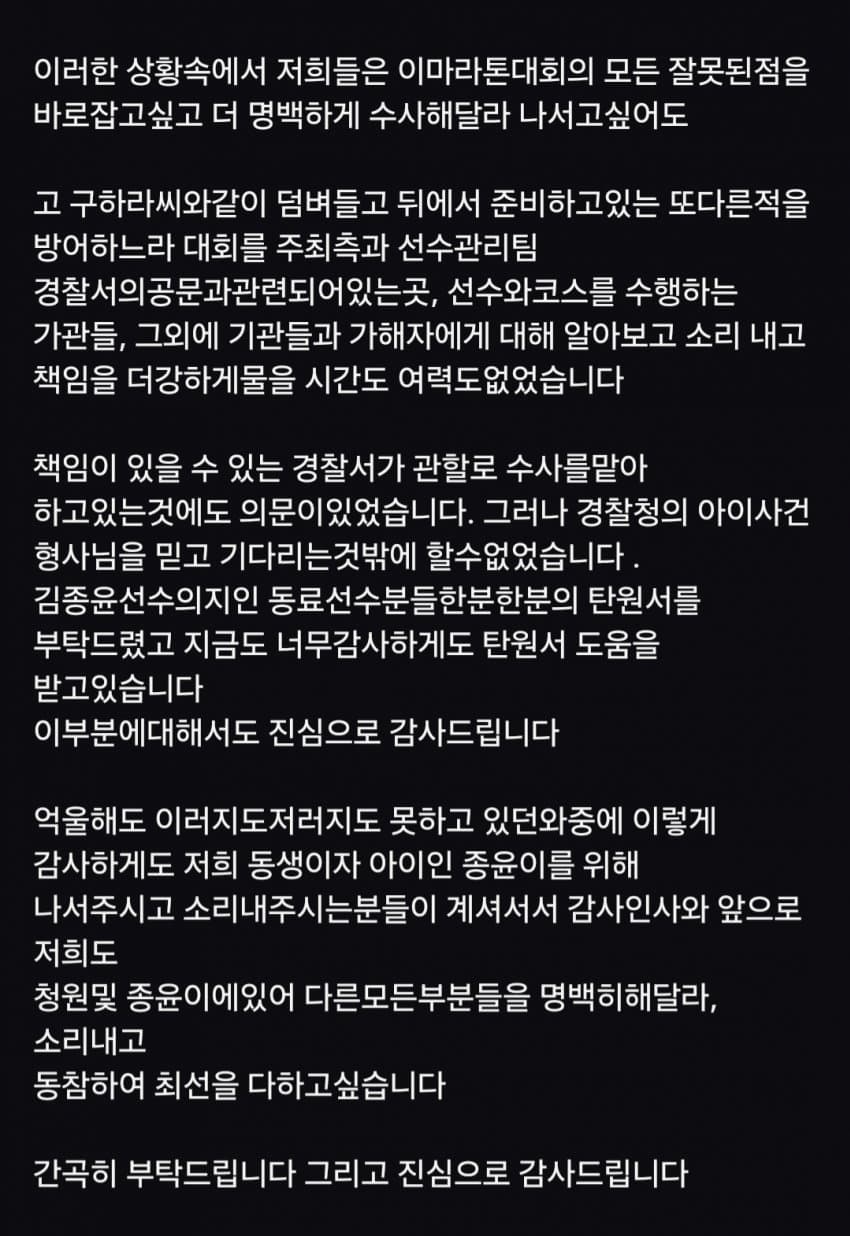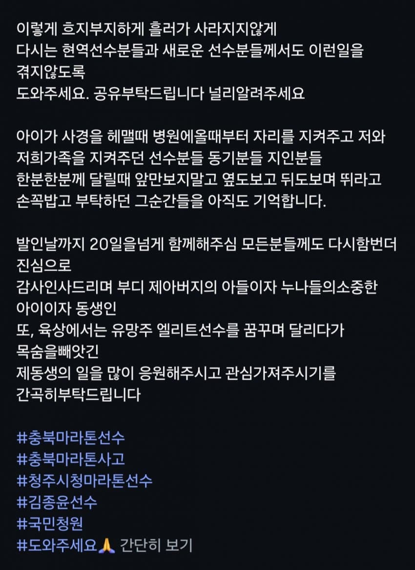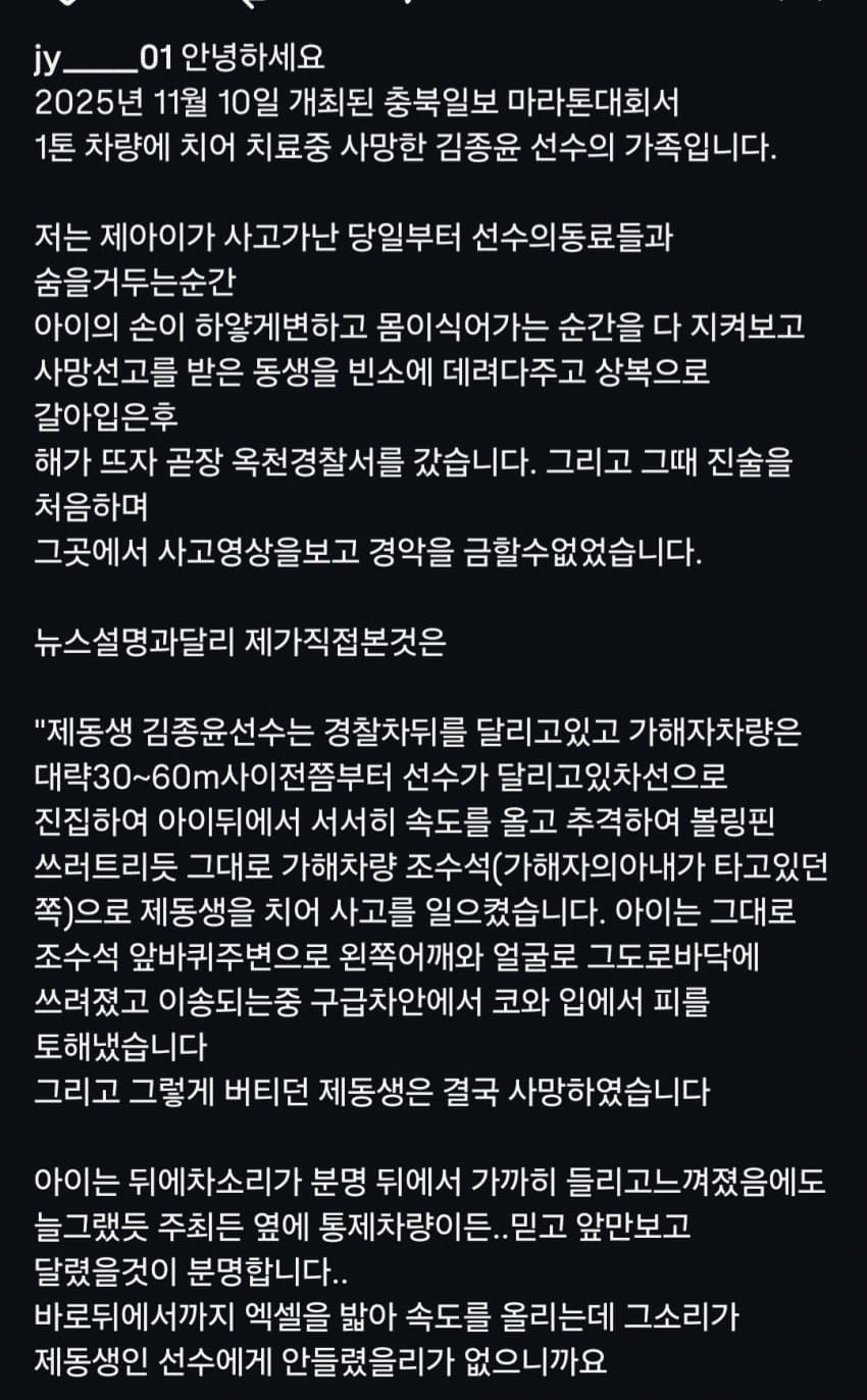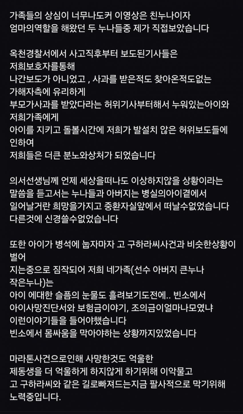 마라톤 대회 中 차에 치여 사망했던 선수 가족 인스타
