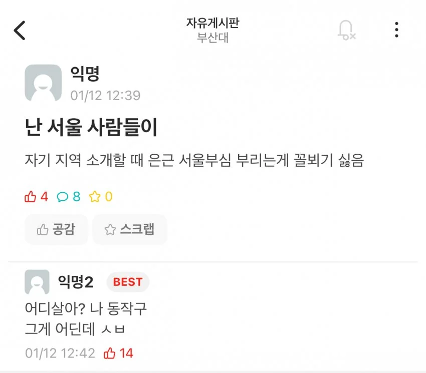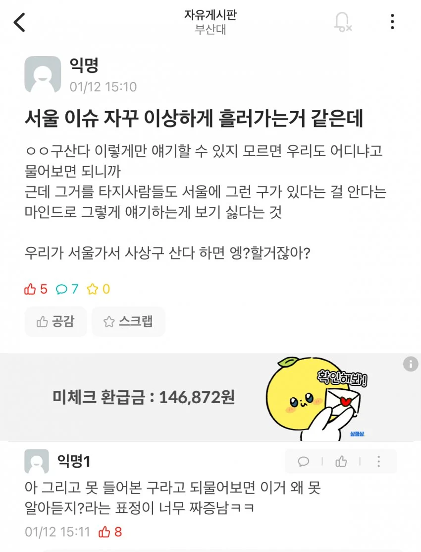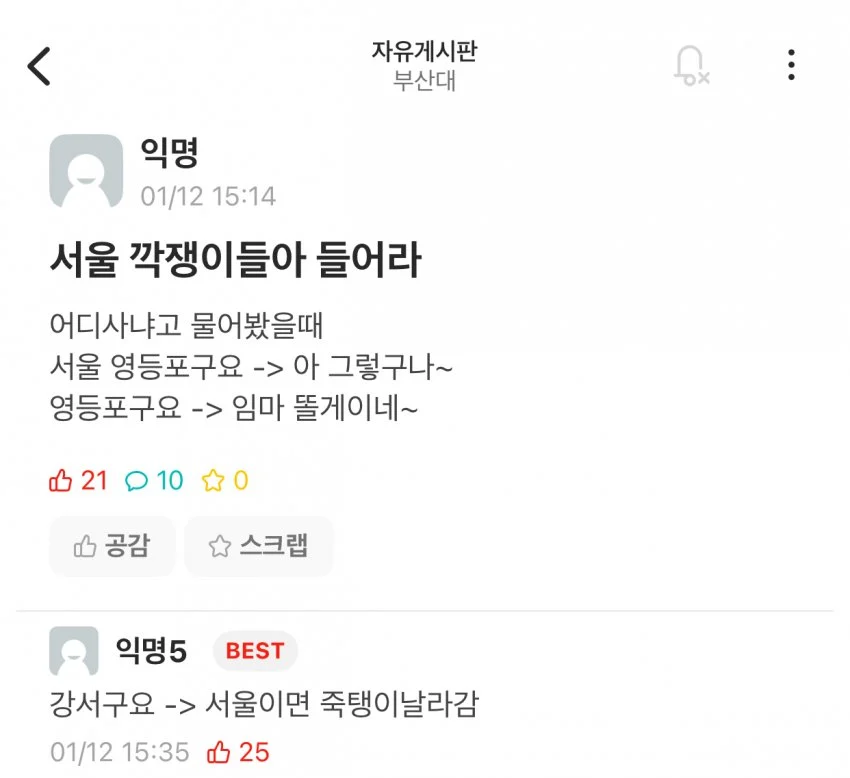 서울 사람 꼴보기 보기 싫은 이유 올라온 부산대 에타