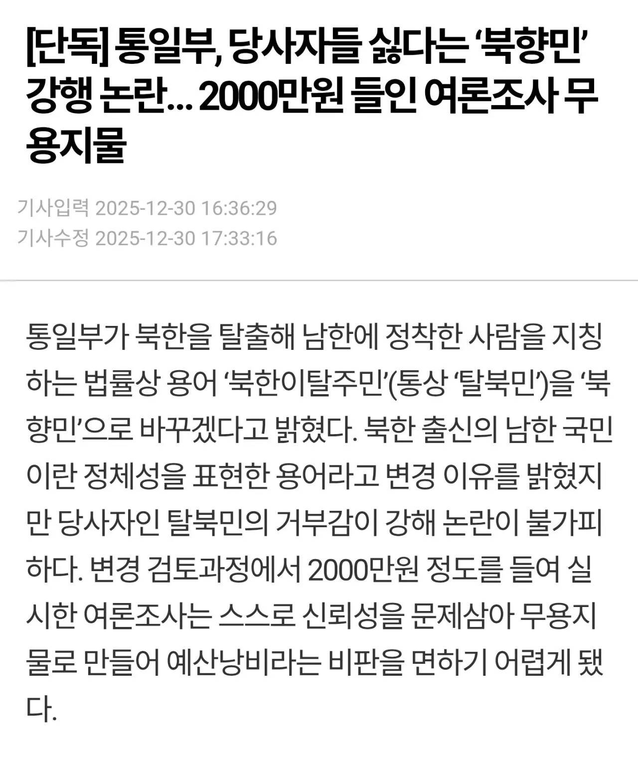 내년부터 "탈북민" 단어 사용금지... "북향민" 대체 강행