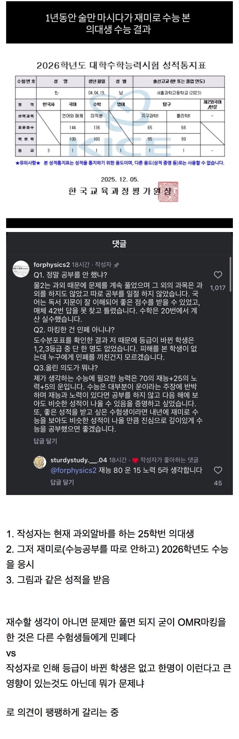 1년동안 술만 마시다가 재미로 수능 본 의대생 수능 결과