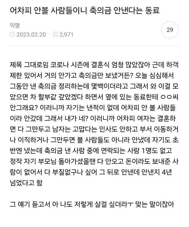 어차피 안볼 사람들이니 축의금 안낸다는 동료