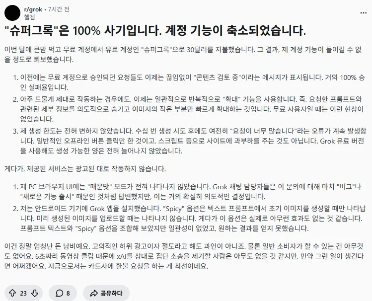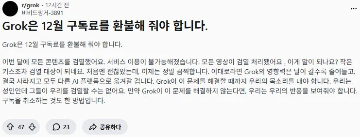 검열이 이제 너무 심해져서 그록을 원하는대로 쓰려고 결제한 사람들이 사기라고 말하는 중