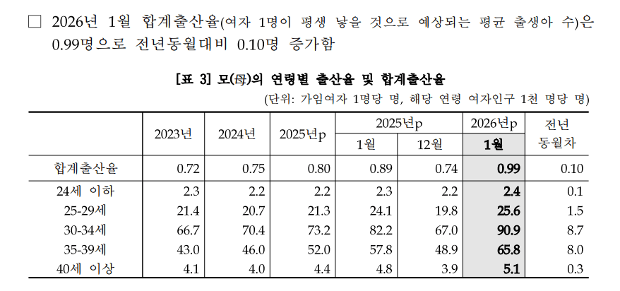 2026년 1월 대한민국 출산율 근황