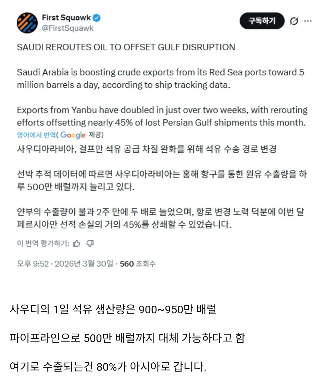 사우디, 홍해 항구로 석유 하루 500만 배럴 수출