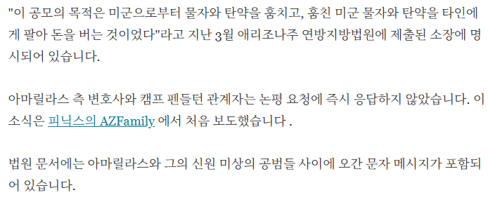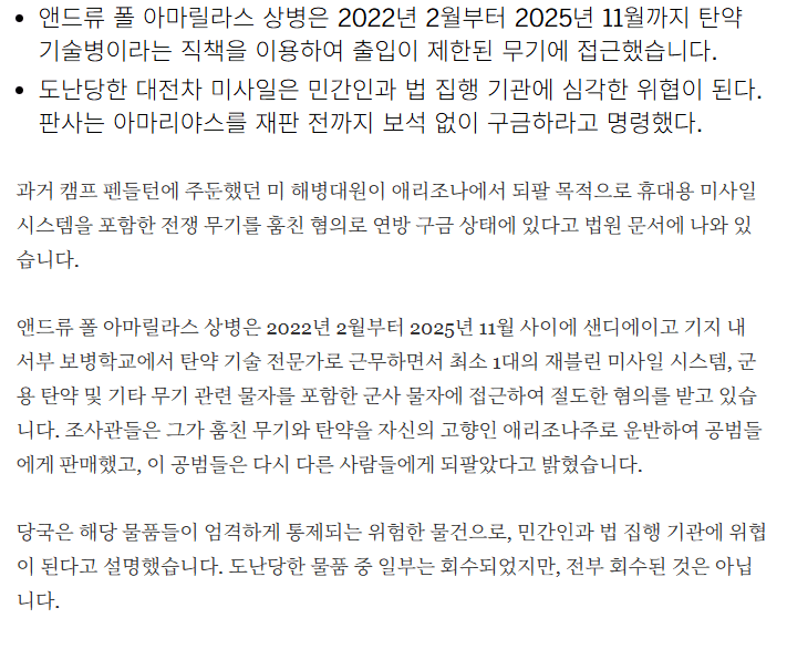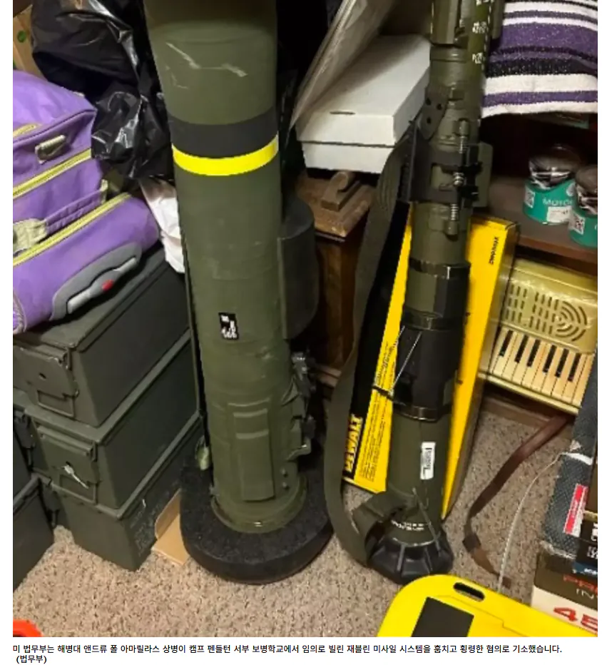 미 해병대 앤드류 폴 아마릴라스 상병 (탄약기술병)이 주둔지 탄약고에서 재블린 대전차 미사일과 탄약 200만발 이상을 긴빠이해서 판매한 사건이 발생