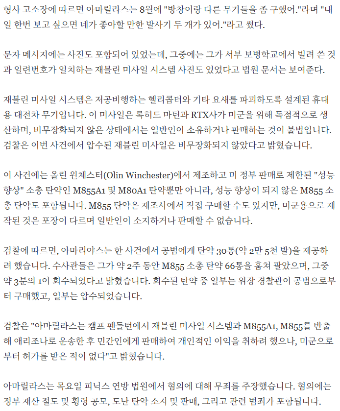 22년부터 범행이며 최소 1대의 재블린과 200만발 이상의 각종 소총탄을 빼돌려서 공범들에게 판매. 공범들은 그걸 또 다른 고객들에게 판매.